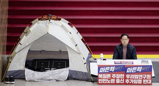 박수영 국민의힘 의원은 지난 2일 마은혁 헌법재판관 후보자 임명을 반대하며 국회 본관에서 무기한 단식농성에 돌입했다.