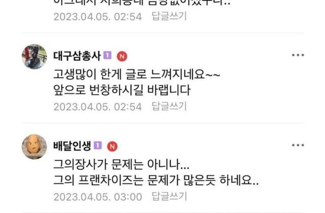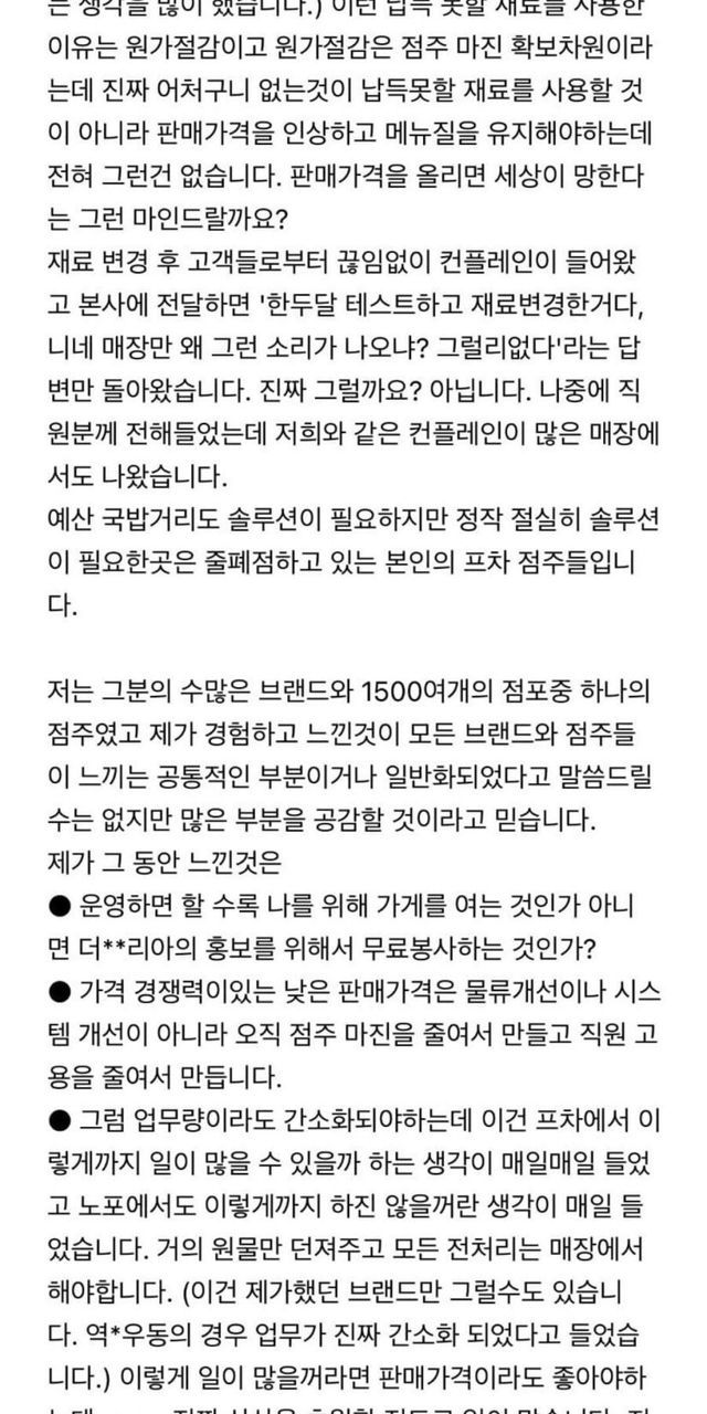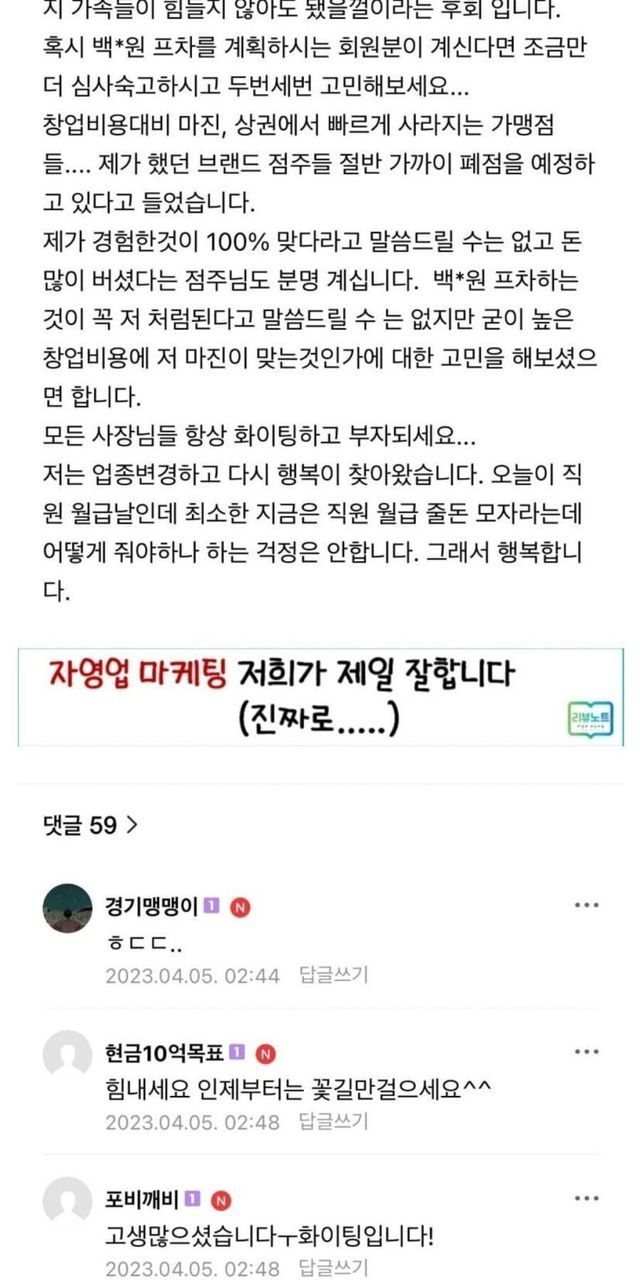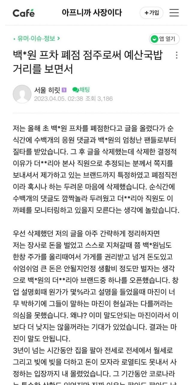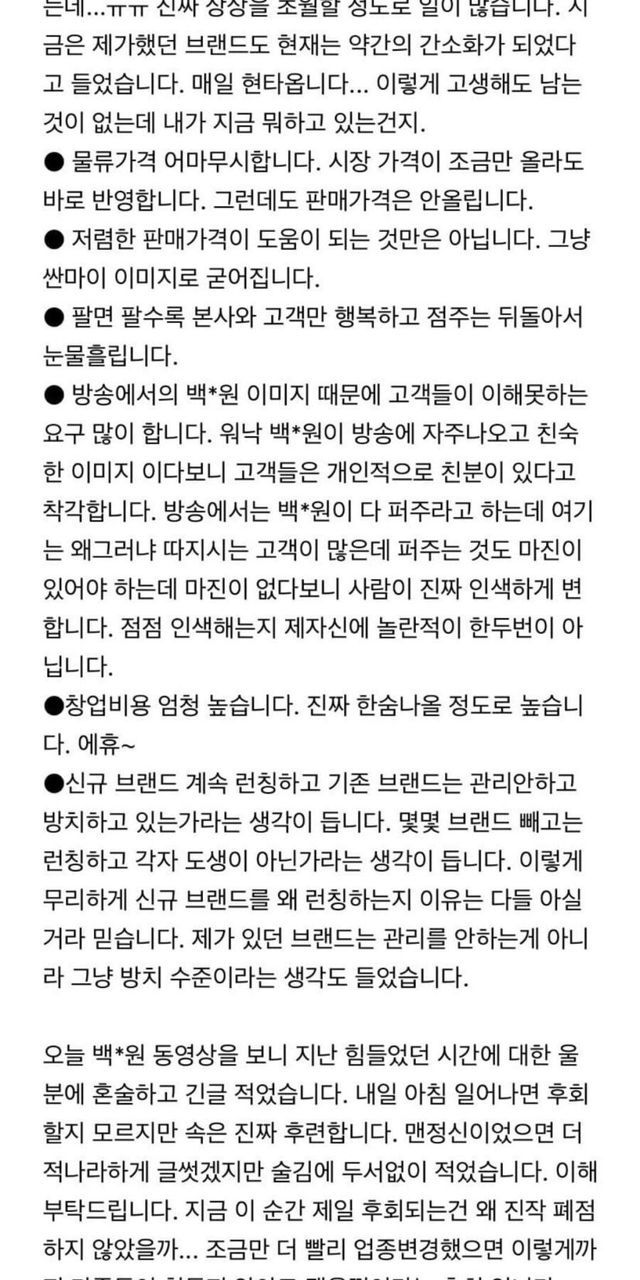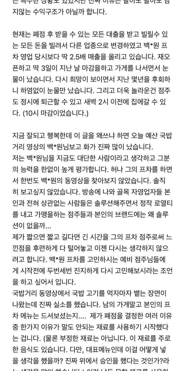 2년전 백종원 프차 폐업 점주의 게시물