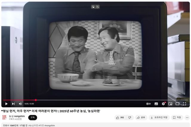 이번 광고는 농심라면 출시 당시 광고 영상을 그대로 활용했다. 신규 광고 영상은 '농심라면(구봉석, 곽규석)-1975'라는 비디오테이프를 재생하면서 시작된다. 비디오를 재생하자 당대 최고 스타였던 구봉서와 곽규석이 "형님 먼저, 아우 먼저"라며 라면을 서로 양보하는 모습이 나온다.
