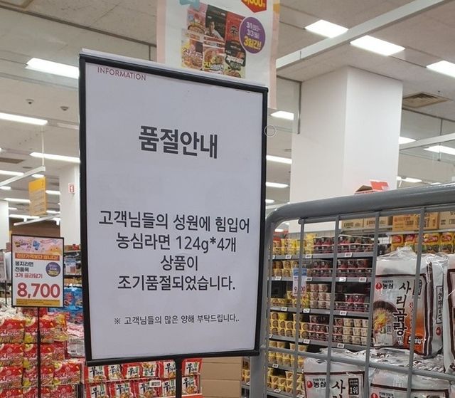 국내 한 대형마트에 '농심라면' 품절 안내문이 적혀있다. ⓒ 온라인커뮤니티 캡쳐