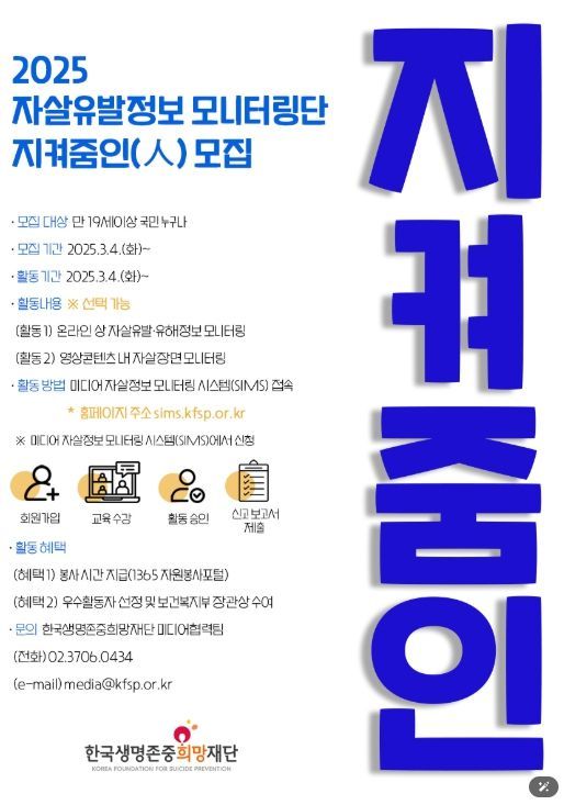 한편, 온라인상 자살유발정보를 국민이 직접 찾아서 신고하는 자살유발정보 모니터링단 ‘지켜줌인(人)’활동이 3월부터 시작된다. ‘지켜줌인(人)’은 2014년부터 활동하고 있으며, ’24년에는 897명이 모니터링단으로 활동했다. 자살예방에 관심 있는 19세 이상 국민이라면 누구나 참여할 수 있으며, ‘미디어 자살정보 모니터링 시스템(SIMS, sims.kfsp.or.kr)’을 통해 회원가입 후 사전교육을 받으면 본인이 원할 때 활동이 가능하며, 활동 실적에 따라 봉사시간이 지급된다.
