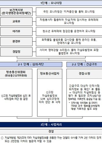 자살유발정보가 발견되면 정보통신사업자의 내부 심의규정 또는 방송통신위원회 심의를 통해 즉각적인 삭제·차단 조치가 이루어진다. 더 중요한 것은 이 과정에서 자살위험성이 높은 대상자가 발견될 경우, 경찰·소방청 및 정보통신서비스 제공자와 연계한 긴급구조 시스템이 가동된다는 점이다.