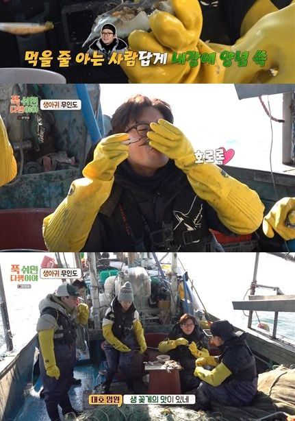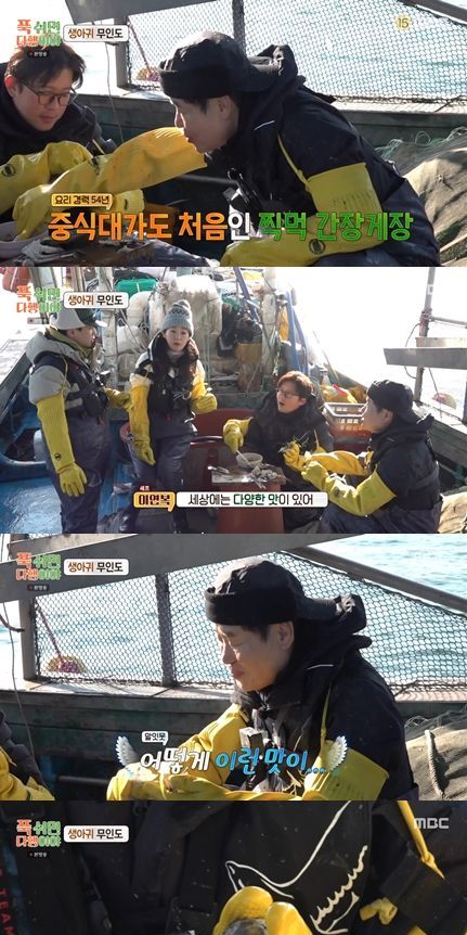 이날 배에 탄 '푹다행' 멤버들이 제철 식재료 아귀를 잡기 위해 열심인 가운데, 선장님이 "지금 힘들게 고생하시니까 제가 꽃게를 가지고 간장게장 만들어드리겠다"며 모두를 군침 돌게 만들었다.