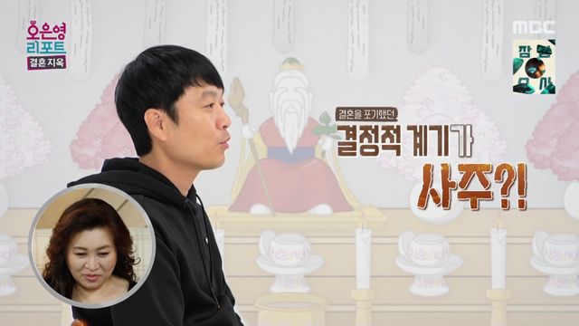 남편은 "궁합이 안 맞는다고 했었고, 살이 꼈다고 했었고, 범띠(아내)랑 닭띠랑 안 맞는다고 원진살이 있다더라"며, 당시 본 사주풀이를 전했다.