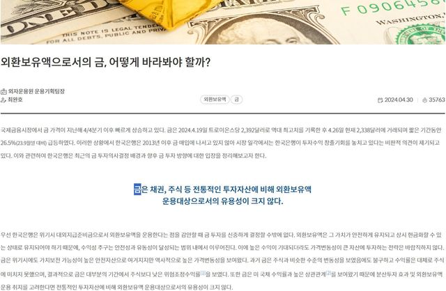한국은행은 지난해 4월 “금 가격 고평가 견해가 우세하다”라며 “향후 투기적 금 선물 매입 포지션이 청산되면 가격 하락 요인으로 작용할 여지가 있다”라며 금 추가 매입에 신중한 자세를 나타냈다. /자료=한국은행 공식 블로그