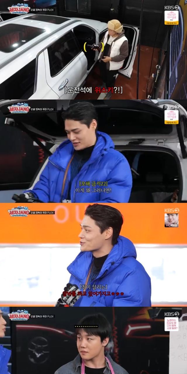 이어 차 내부를 살피던 장성규는 운전석 옆에 꽂혀있는 위스키 병을 살피며 "얘 큰일이다. 운전석에 위스키 있다"고 폭로했다.