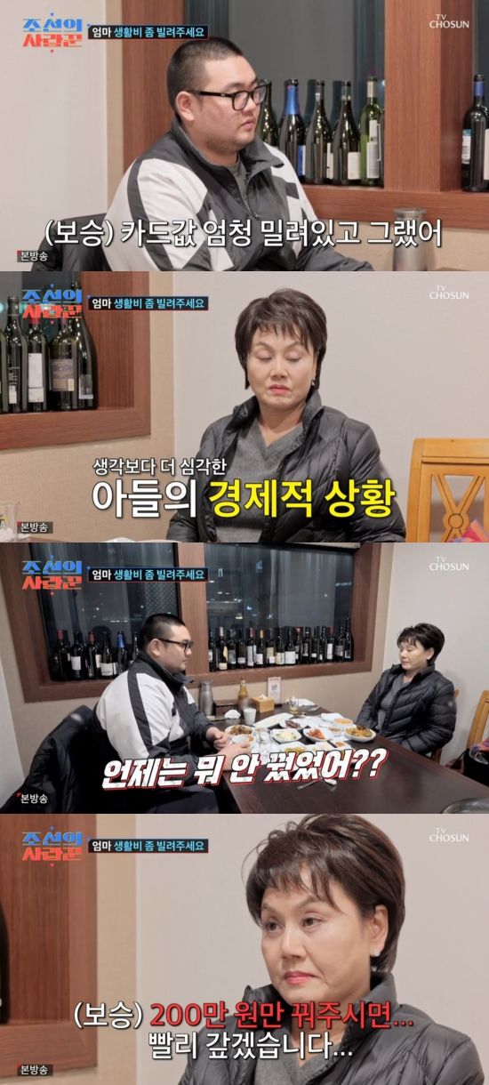 이경실은 "돈? 생활비가 딸려? 편하게 얘기해. 네가 뭐 엄마한테 안 꿨었어?"라며 밝혔고, 손보승은 "갚은 지 너무 얼마 안 되어가지고. 카드값이랑 관리비랑 휴대폰 비랑 200만 원만 꿔주시면 빨리 갚겠다. 빨리는 아니고 조만간"이라며 부탁했다.