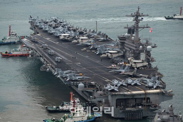 앞서 미국 해군 항공모함 칼빈슨함(CVN)은 지난 2일 부산작전기지에 입항했다. 비행갑판이 축구장 3배 크기에 달하며 스텔스 전투기 F-35C 등 항공기 80~90대를 탑재할 수 있어 ‘떠다니는 군사기지’라 불린다.