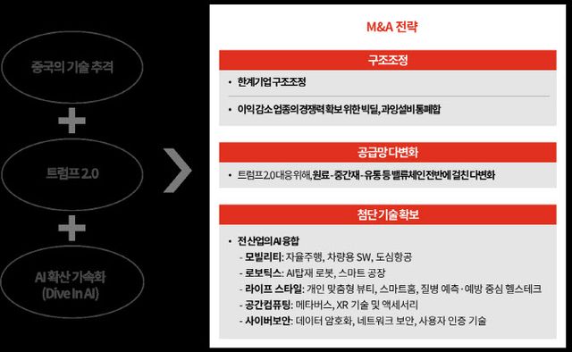 보고서는 중국의 기술 추격, 트럼프 정책에 따른 공급망 위험 증가, AI가 주도하는 기술 혁신 속에서 △산업구조 개편 △공급망 다변화 △첨단 기술 확보 등을 위해 적극적인 M&A로 해결책을 찾아야 한다고 제언했다.