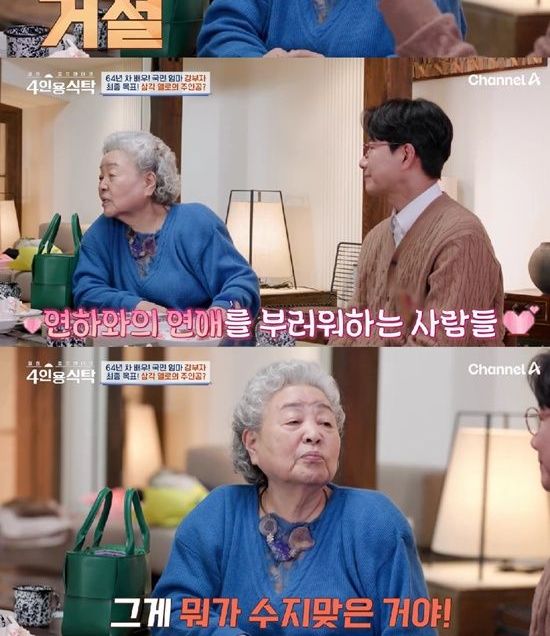 삼각관계를 찍을 남자 배우에 대해 조우종은 "김혜자 선배님이 손석구 씨하고 로맨스를 찍었다더라"며 조인성과 공유를 추천했고, 강부자는 "무슨 손주 뻘을. 그건 삼강오륜에 어긋난다. 다 싫다. 사람들이 연하와 산다고 하면 수지 맞는다고 하는데 뭐가 수지가 맞냐. 연상 만나 존경하는 삶이 더 좋다"고 직언했다.