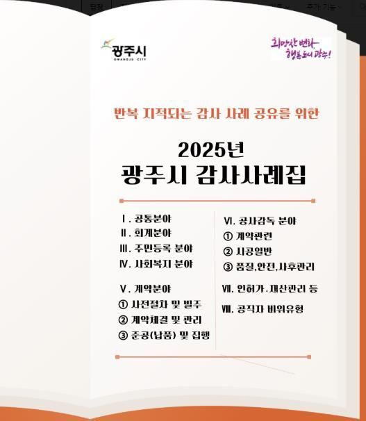[와이뉴스] 광주시는 최근 3년간 종합감사와 특정감사, 조사 등을 실시하며 감사 결과 주요 지적 사례를 전 직원과 공유하기 위해 ‘2025 감사사례집’을 전 부서에 배포했다고 4일 밝혔다.