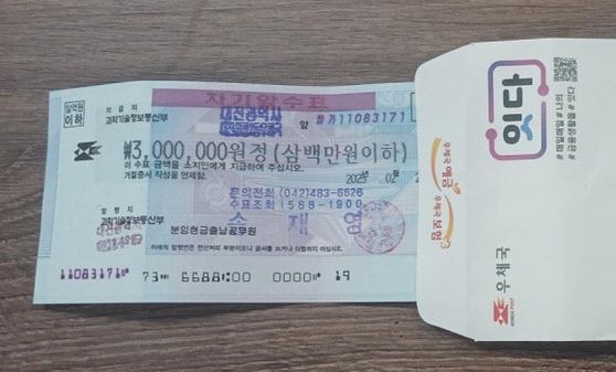3일 대전 서구 월평2동 행정복지센터 등에 따르면 지난달 26일 93세 할머니가 복지센터를 찾아와 300만원 짜리 수표가 든 종이봉투를 전달했다.