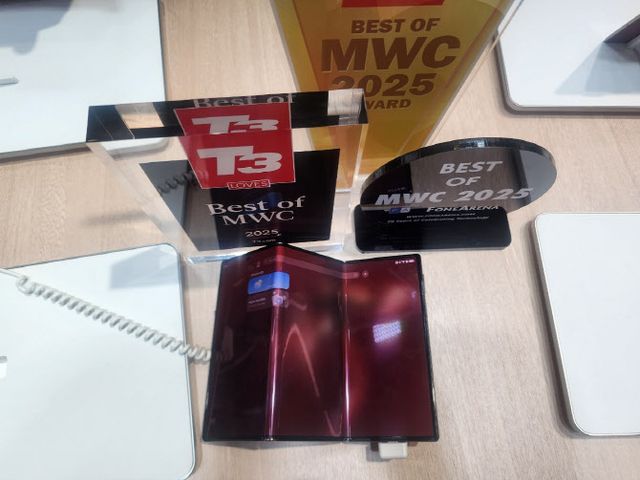 화웨이는 두 번 접을 수 있는 ‘메이트엑스티(MateXT)’를 선보여 개막 당일 관람객들에게 화제였다. 스마트폰 기기 옆에는 폰아레나와 T3이 선정한 ‘MWC2025’ 최고 상품이라는 안내판도 있었다.
