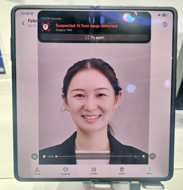 또 아너는 사진에서 AI 보안 기술로 매직 V3에서 조작된 영상을 걸러낼수 있는 기술을 선보였다. 영상 화면 상단에서 탐지 시작을 누르자 몇 초 이내에 AI가 조작 여부를 탐지해 알람을 띄워 줬다.