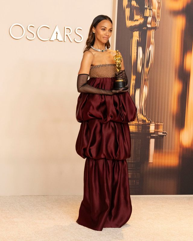 영화 〈에밀리아 페레즈〉로 여우 조연상을 수상한 조 샐다나는 안토니오 바카렐로가 디자인한 생로랑 드레스를 입고 등장했다. 스킨 컬러의 바스트와 삼 단의 층을 이룬 버블 헴 드레스와 볼드한 까르띠에 펜더 네크리스로 시선을 모았다. 제작에만 34개월이 걸린 이 대담한 주얼리는 그녀가 여우 조연상을 수상하면서 더욱 빛났다.