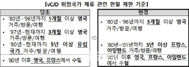 영국 등 유럽은 과거 일명 ‘인간 광우병’으로 불리는 변종 크로이츠펠트-야콥병(vCJD)이 발생했던 지역이다. 그간 변종 크로이츠펠트-야콥병(vCJD) 발생 및 수혈전파 위험을 우려해 정부는 영국의 경우 1980~1996년가지 1개월 이상, 1997~현재까지 3개월 이상 체류한 경우, 유럽은 1980년부터 현재까지 5년 이상 체류자의 경우 헌혈을 영구 금지해왔다.