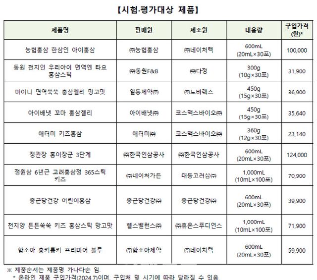 시험 결과, 10개 제품에 표시된 일일섭취량을 준수할 경우 어린이가 하루에 섭취하게 되는 ‘진세노사이드’는 모든 제품이 건강기능식품 일일섭취량 기준을 충족했다. 식품의약품안전처 고시에 따르면 진세노사이드 일일섭취량은 2.4~80mg이다.