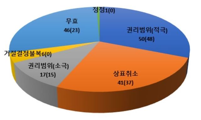 권리별로는 상표분야의 비중(100건, 62.1%)이 가장 높고, 특허·실용신안(32건, 19.9%), 디자인(29건, 18.0%) 순으로 나타났다. 심판종류별로는 권리범위확인심판(67건, 41.6%)과 무효심판(46건, 28.6%), 상표취소심판(41건, 25.5%)에서 많이 활용되고, 거절결정불복심판(6건, 3.7%)에서의 활용은 상대적으로 낮아, 권리의 대항을 받는 중소기업이 방어를 목적으로 국선대리인 제도를 많이 활용하고 있는 것으로 보인다.
