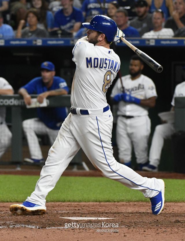 무스타커스는 2007년 신인 드래프트 1라운드 전체 2순위 지명으로 캔자스시티와 인연을 맺었다. 2011년 메이저리그(MLB)에 데뷔한 그는 2023시즌까지 통산(13년) 1427경기에 출전, 타율 0.247(1252안타) 215홈런 683타점을 기록했다. 2018년 7월 밀워키 브루어스로 트레이드된 뒤 신시내티 레즈, 콜로라도 로키, LA 에인절스, 시카고 화이트삭스 등을 거쳤는데 선수 생활에서 가장 빛난 시기가 바로 캔자스시티에서 뛴 8년이었다. 무스타커스는 통산 홈런의 65%인 139개를 로열스 소속으로 때려내기도 했다.