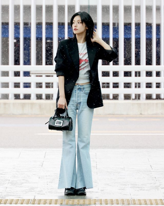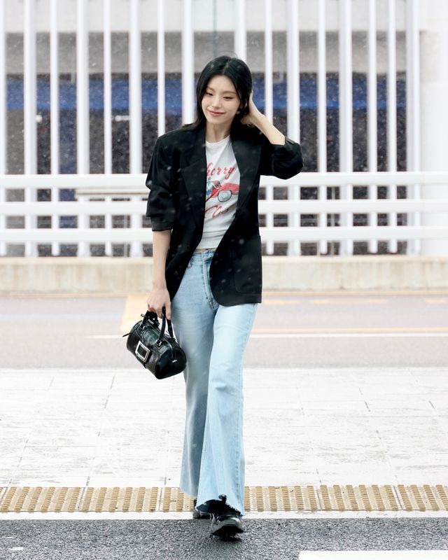 이날 예지는 캐주얼하면서도 스타일리시한 공항패션을 연출했다. 블랙 재킷과 프린팅 티셔츠를 매치해 편안하면서도 감각적인 무드를 연출했으며, 여기에 연청 데님 팬츠를 더해 자연스럽고 트렌디한 분위기를 완성했다.