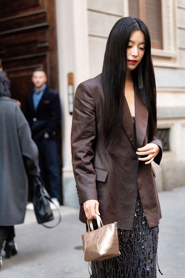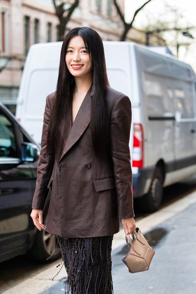 한효주는 화려한 수술 디테일이 돋보이는 검정 드레스에 벨트를 착용해 실루엣을 강조했으며, 오묘한 컬러감의 브라운 블레이저 재킷을 매치해 스타일리시한 감각을 더했다. 여기에 실용성과 우아함을 갖춘 '듀오 백(DUO BAG)'을 함께 착용해 스타일의 완성도를 높였다.