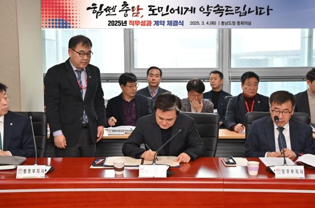 [파이낸셜경제=김예빈 기자] 충남도는 4일 도청 대회의실에서 ‘성과 중심의 도전적인 과제’라는 김태흠 지사의 의지를 반영한 4급 이상 간부 대상 ‘2025년 직무성과 계약’을 체결했다.