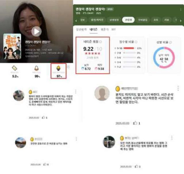 특히 '괜찮아 괜찮아 괜찮아'는 개봉 직후부터 CGV 에그지수 97%, 네이버 네티즌 평점 9.22로 현재 상영중인 실사영화 중 가장 뜨거운 반응을 얻고 있을 뿐만 아니라, 영화를 관람한 관객들의 특별한 리뷰가 쏟아지는 상황이다.
