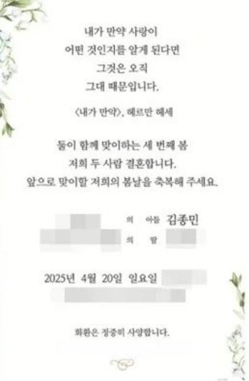 공개된 청첩장에는 헤르멘 헤세의 "내가 만약 사랑이 어떤 것인지를 알게 된다면 그것은 오직 그대 때문이다"라는 내용이 담겨 있다. 이어 청찹장에는 "둘이 함께 맞이하는 세 번째 봄 저희 두 사람 결혼한다. 앞으로 맞이할 저희의 봄날을 축복해 주세요"라는 내용이 기입돼 눈길을 끌었다. 이밖에 청첩장에는 "화환은 정중히 사양한다"는 내용도 포함됐다.