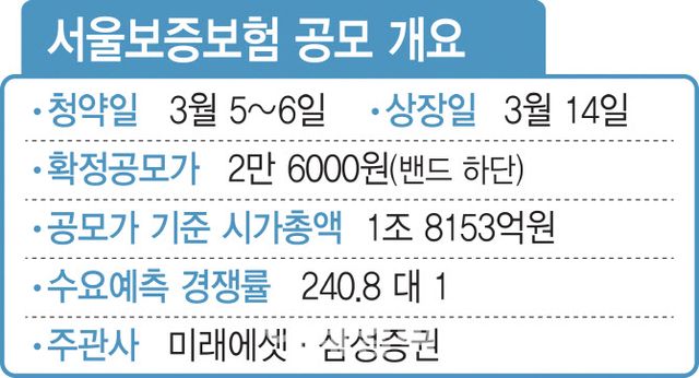 서울보증보험은 4일 금융위원회 산하 공적자금관리위원회의 논의를 거쳐 공모가를 희망밴드(2만6000원~3만1800원) 하단인 2만6000원에 확정했다. 서울보증보험에 따르면 지난달 20일부터 26일까지 5영업일간 진행한 국내외 기관투자자 대상 수요예측에 국내 1421곳, 해외 88곳 등 총 1509곳의 기관이 참여해 9억 2465만주를 신청했다. 이에 따른 경쟁률은 240.8대 1로 2월 수요예측 평균경쟁률 826대 1에 미치지 못했다.