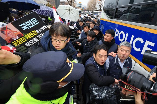 한편 이날 헌재 앞에서는 탄핵 반대 단체와 지지자들의 집회도 열려 혼란이 빚어졌다. 이날 오전 11시부터 탄핵 반대 측인 국민변호인단은 서울대·연세대·고려대 등 각 대학 학생들과 자유시민청년단 등 단체들과 함께 헌재 결정 시까지 무제한 탄핵 기각 기자회견을 열고 있다.