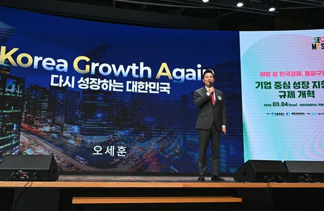 | ▲ 오세훈 서울시장이 4일 오전 '기업 중심 ‘성장 지향형 규제개혁’ 포럼'에 참석해 ‘KOrea Growth Again(다시 성장하는 대한민국)’을 주제로 기조연설을 하고 있다. |