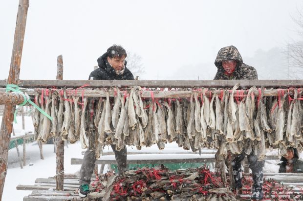 이후, 김 지사는 거센 칼바람과 많은 눈이 몰아치는 황태덕장에서 사다리를 타고 올라가 혹한을 견뎌낸 무르익은 황태를 덕에서 내리고 손으로 꿰어진 줄을 떼내며 마대에 옮겨 담았다.