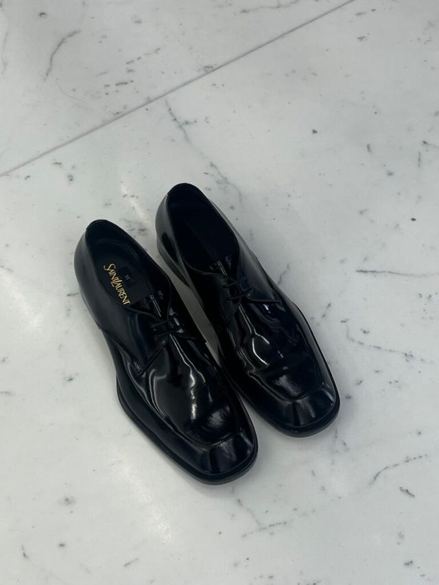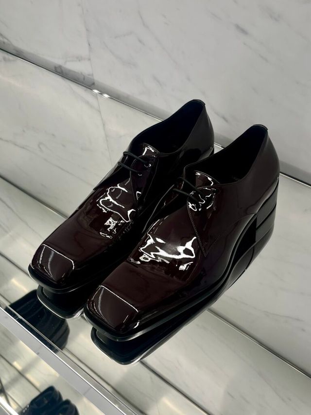 신발도 살펴볼까요? 남성 슈즈는 스퀘어 토가 돋보이지만, 여성 슈즈는 슬림하고 길쭉한 포인티드 토가 눈에 띄는데요. 공통점은 반짝이는 글레이즈드 가죽을 사용했다는 점!