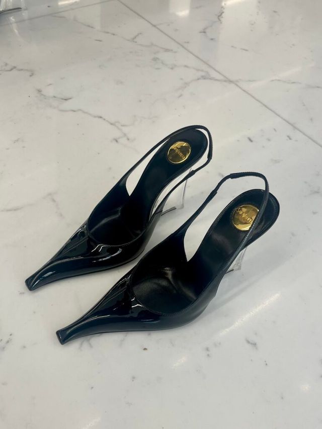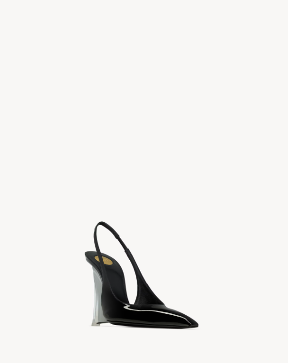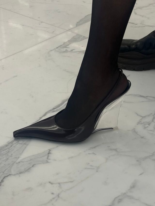 글레이즈드 가죽과 투명 힐이 조화롭게 어우러진 밀러 웨지 힐로 하겠습니다. 슬림한 포인티드 토이지만 신발의 밑창 전체를 감싸는 웨지 힐 덕에 안정감있는 착화감이 특징!