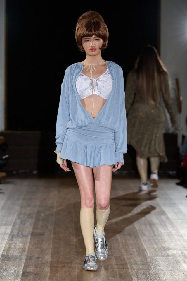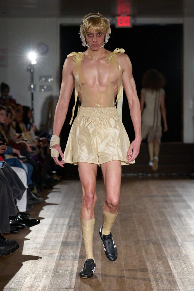2025 F/W 시즌으로 브랜드의 두 번째 컬렉션을 선보이는 게이브 고든(GABE GORDON). 니트웨어를 주로 다루는 그답게 런웨이 곳곳에서 니트 소재를 만날 수 있었습니다. 이번 시즌은 ‘고무 남자 친구(RUBBER BOYFRIEND)’ 를 테마로 1980년대 고등학생들의 러브 스토리를 담았는데요. 치어리더와 레슬링 선수를 영감으로 삼았습니다. 컬렉션 전반에는 치어리더의 태슬 응원 도구, 응원복 그리고 레슬링 선수들이 사용하는 이어가드, 고무로 만든 레슬러 옷 등이 등장했죠.