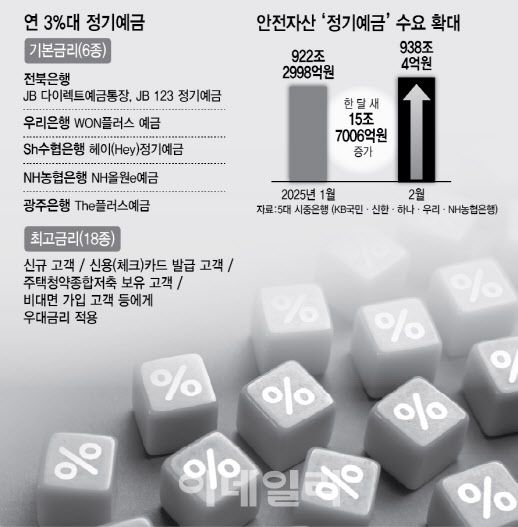 하지만 가입액과 우대금리를 고려하면 연 3%대 이자를 챙길 수 있다. 100만원부터 가입할 수 있는 전북은행 ‘JB 다이렉트예금통장’과 ‘JB 123 정기예금’은 각각 3.05%, 3%의 기본 금리를 유지하고 있다. 1만원부터 가입할 수 있는 우리은행 ‘WON플러스 예금’, 10만원부터 통장을 개설할 수 있는 수협은행 ‘헤이(Hey)정기예금’, 농협은행 ‘NH올원e예금’, 1000만원부터 신규로 적립할 수 있는 광주은행 ‘The플러스예금’이 연 3%의 기본 금리를 적용한다.