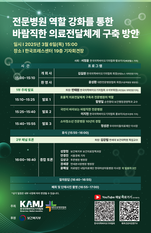 토론회 1부에서는 서정윤 한국의학바이오기자협회 홍보이사(매경헬스 기자)의 사회로 ▲효율적 의료전달체계 구축과 전문병원의 역할(함명일 순천향대 의료과학대학 보건행정경영학과 교수) ▲국민이 바라보는 바람직한 전문병원(이지현 한국의학바이오기자협회 부회장) ▲소아청소년 전문병원 10년의 경험(정성관 우리아이들의료재단 이사장) 등 주제 발표가 진행된다.