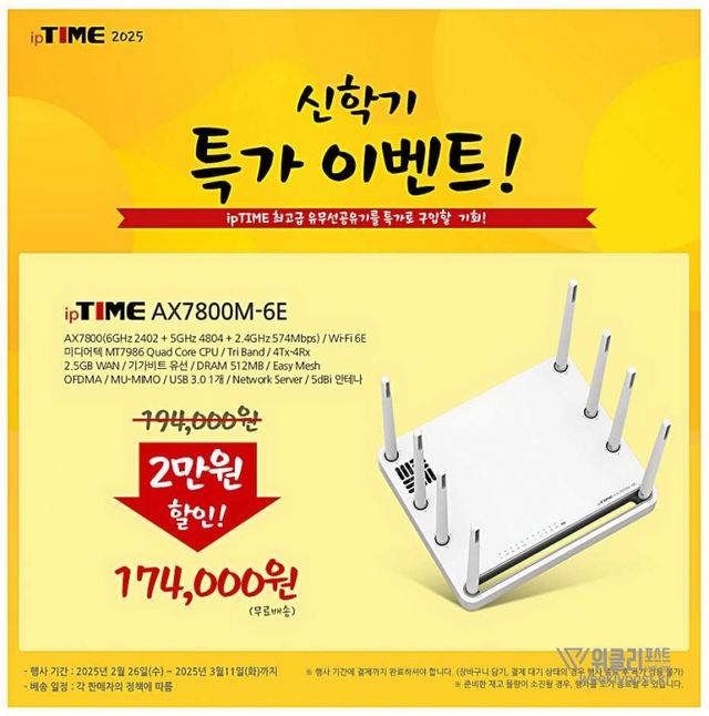이에프엠네트웍스가 AX7800M-6E 공유기를 대상으로 신학기 특가 이벤트를 진행한다. 이번 이벤트는 2월 26일부터 3월 11일까지 약 2주간 진행되며, 해당 모델을 기존 가격 19만 4,000원에서 17만 4,000원으로 할인된 가격에 구매할 수 있다.