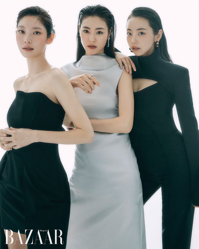 공승연이 착용한 드레스는 Noir Larmes. 이연희가 착용한 모노크로매틱 레이어드 룩은 Sportmax. 다이아몬드 귀고리, 반지는 Graff. 안소희가 착용한 점프수트, 톱은 Pinkong. 귀고리는 스타일리스트 소장품.