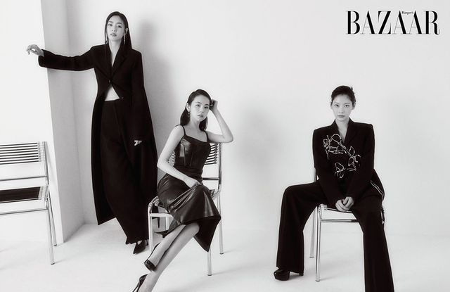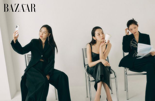 이연희가 착용한 맥시 코트, 테일러드 팬츠는 Sportmax. 다이아몬드 귀고리, 반지는 Graff 안소희가 착용한 레더 드레스는 Pinkong. 귀고리는 McQueen. 공승연이 착용한 재킷, 팬츠는 Erdem.