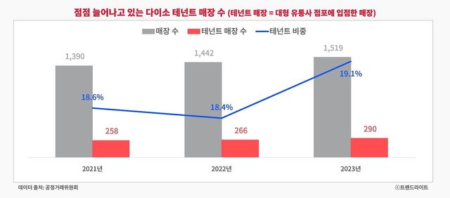 다이소는 전략적으로 매장의 대형화를 추진 중이며, 이로 인해 테넌트 매장 수와 비중도 늘어나고 있습니다