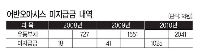 ‘공사 미지급금’ 항목에서도 엇비슷한 흐름을 엿볼 수 있다. 2009년 말 기준 41억원이었던 어반오아시스의 미지급금은 2010년 말 1025억원(공사 미지급금 942억원)으로 급격히 증가했다.