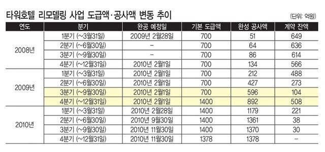 어반오아시스는 2007년 4월 쌍용건설과 700억원에 도급계약을 체결했고, 계약은 2009년 9월말까지 변동 없이 이어졌다. 여기까지만 보면 타워호텔 리모델링 사업은 전형적인 총액계약방식(시행사와 시공사가 총액계약으로 공사도급계약을 맺고 공사를 진행)으로 비춰진다. 기준 도급액이 700억원으로 고정된 상태에서 완성 공사액이 나날이 증가하는 형상을 나타낸 까닭이었다.