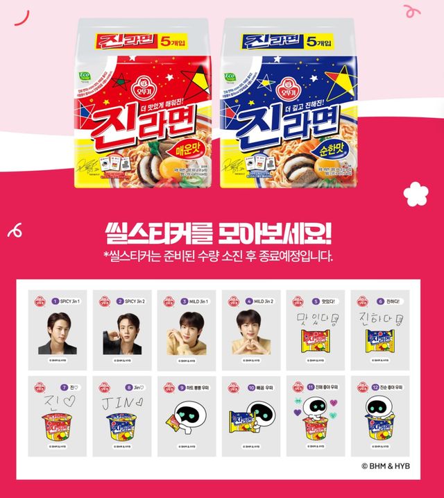 오뚜기가 진라면의 글로벌 모델 방탄소년단(BTS) 진의 씰스티커 라인업을 공개했다.