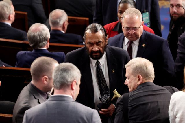 이날 상·하원 합동회의 연설에 나선 트럼프 대통령이 “미국이 돌아왔다”며 공화당의 선거 승리를 자축하는 발언을 이어갈 때 민주당 소속 알 그린 텍사스주 하원의원이 갑자기 자리에 일어서 고함을 쳤다. 그는 갖고 있던 지팡이를 흔들며 트럼프 대통령을 향해 미국의 공공의료 보험인 메디케이드를 삭감할 “권한이 없다”고 항의했다.