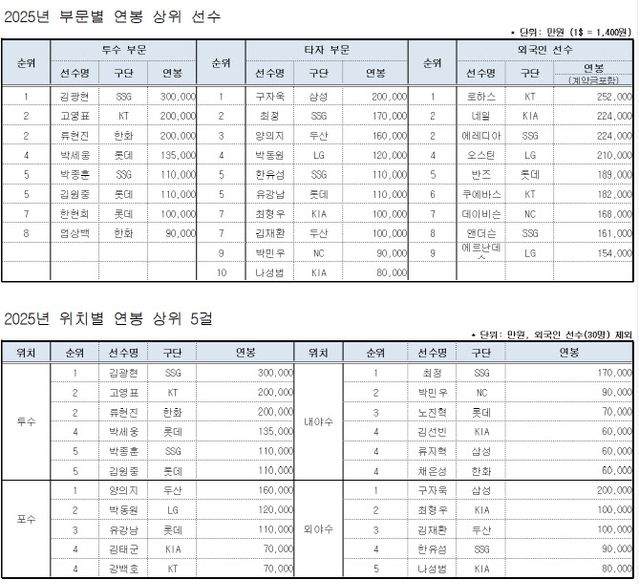 지난 시즌 KBO 리그에 복귀해 외야수 부문 골든글러브를 수상한 멜 로하스 주니어(KT)가 180만 달러의 연봉으로 외국인 선수 연봉(계약금 포함) 1위에 올랐다. 2024 시즌 KIA의 우승을 이끈 제임스 네일과 지난 시즌 타격왕을 차지한 기예르모 에레디아(SSG)가 총액 160만 달러로 공동 2위에 올랐다.