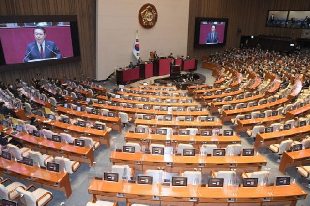 윤 대통령이 지적했던 야당 의원들의 ‘태도’는 지난 2022년, 2023년 국회 시정연설 때다. 2022년 10월 25일 시정연설 때는 야당인 더불어민주당에서 시정연설 시작부터 보이콧하면서 ‘반쪽 국회’가 연출됐다.