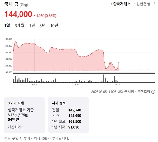 국내 금시세(금값)가 5일 오후 상승세(전 거래일 대비)를 보이고 있다.