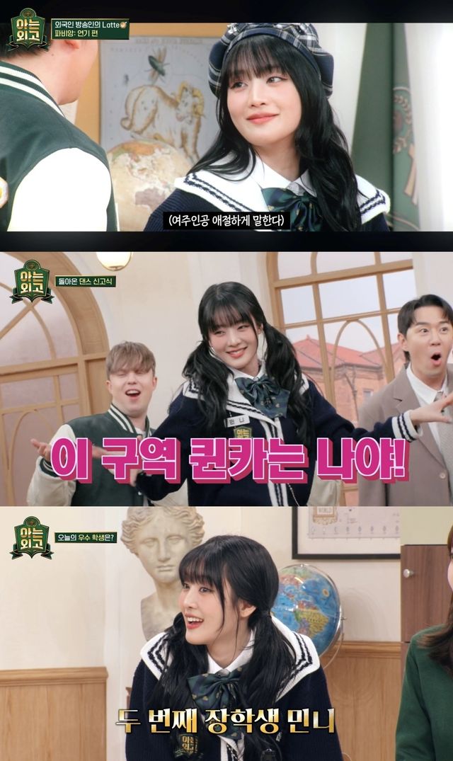 이날 민니는 '아는 외고'에 선배들이 출격한다는 소식을 듣자 "선배님들 너무 무섭다. '민니가 누군데' 하면 어떡하냐"며 귀여운 걱정을 표했다. 하지만 민니는 같은 태국 출신인 닉쿤을 비롯해 아유미, 줄리안, 파비앙이 등장하자 반갑게 인사를 나누며 미소 지었다.