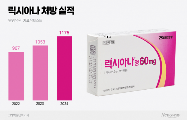 릭시아나는 다이이찌산쿄가 개발한 경구용 DOAC로, 국내에서는 대웅제약이 공동 프로모션을 진행하고 있다. DOAC 시장에서는 가장 늦게 발매된 후발 주자에 속하지만 빠르게 처방실적을 늘려 2019년 이후 쭉 처방 실적 1위를 유지하고 있다. 지난해 원외처방액은 1175억원으로 2601억원에 달하는 DOAC 원외처방 시장에서 선두를 기록했다. 한국다이이찌산쿄에 따르면 매출액은 2023년 기준 780억원이다.